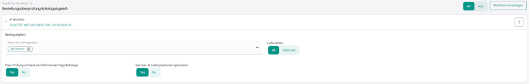 Diese Prüfung vergleicht die Daten der erfassten Positionen einer Bestellung, mit den hinterlegten Konditionen aus Ihren Katalogen. Sie erfolgt nach der Prüfung Ihrer Bestellanfrage, wenn diese aktiviert ist.
