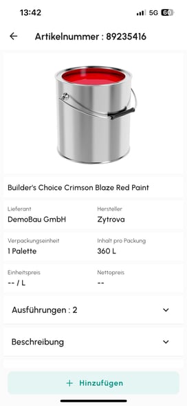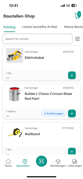 Klicken Sie auf das „+“-Symbol in der jeweiligen Produktkarte, um den Artikel hinzuzufügen. Geben Sie die Menge an und hinterlassen Sie optional einen Kommentar für Ihren Lieferanten.