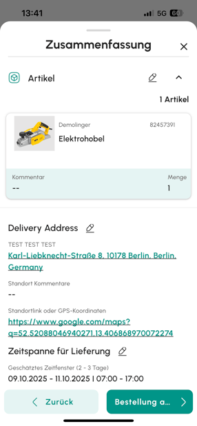 Wählen Sie eine Lieferadresse. Sie können dabei eine der im Projekt hinterlegten Lieferadressen wählen oder durch Tippen auf „Neuen Standort hinzufügen“ eine weitere Lieferadresse hinzufügen. Neu hinterlegte Lieferadressen werden automatisch für künftige Bestellungen gespeichert und können bei der nächsten Bestellung ausgewählt werden. Klicken Sie auf „Weiter“.