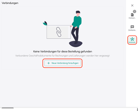 Um eine Bestellung mit weiteren, Bestellungen, Rechnungen oder Lieferungen zu verknüpfen, klicken Sie auf „+ Neue Verbindung hinzufügen“