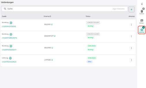 Es wird Ihnen eine Liste relevanter Belege angezeigt, die mit der geöffneten Rechnung verknüpft werden können. Ein integrierter Filter sorgt dafür, dass nur Belege des betreffenden Lieferanten dargestellt werden. Wählen Sie die gewünschten Belege per Checkbox aus und bestätigen Sie Ihre Auswahl unten rechts, um die Verbindung herzustellen.