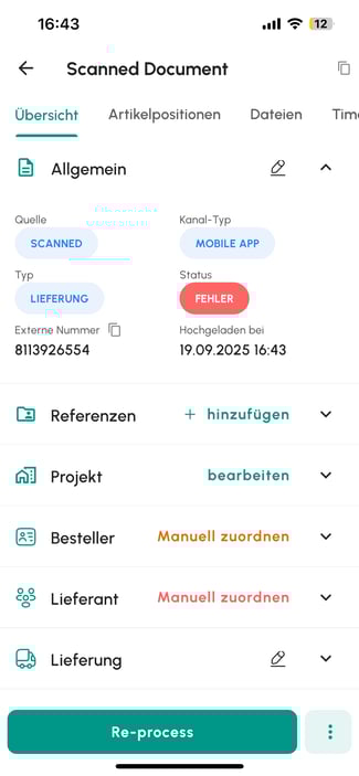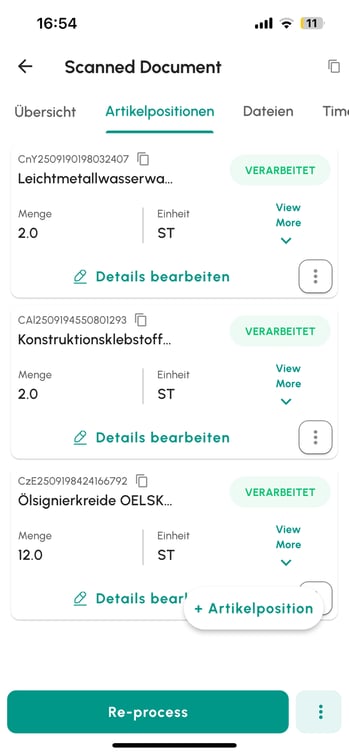Tippen Sie "Artikelpositionen", um die ausgelesenen Positionen zu sehen.