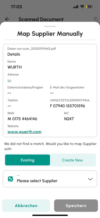 Um einen neuen Lieferanten auszuwählen, wechseln Sie den Reiter "Existing" auf "Create New". Die bereits ausgelesenen Informationen aus dem Beleg können genutzt werden, um den Lieferanten anzulegen.