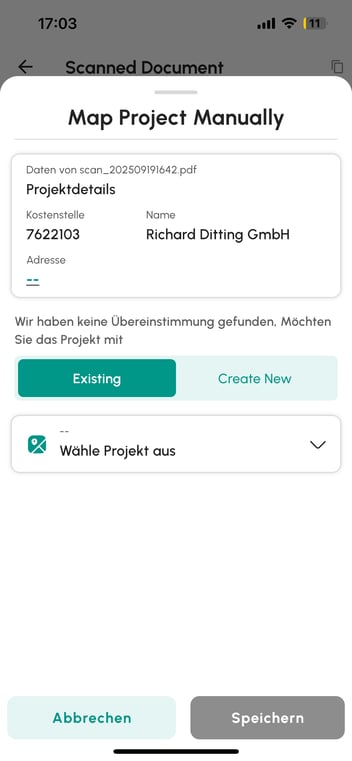 Um ein neues Projekt hinzuzufügen, wechseln Sie im Reiter von „Existing“ auf „Create New“. Die bereits ausgelesenen Informationen aus dem Beleg können für die Projekterstellung übernommen werden. Sie können zusätzliche Angaben machen, indem Sie die entsprechenden Felder ausfüllen. Tippen Sie anschließend auf „Speichern“, um den Vorgang abzuschließen.