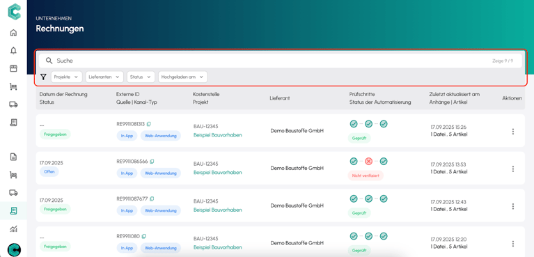 Mit den verfügbaren Filteroptionen können Sie Rechnungen gezielt nach Projekt, Lieferant, Bestellstatus oder Upload-Datum selektieren. Alternativ steht Ihnen eine Suchfunktion zur Verfügung, um gezielt nach Rechnungen eines bestimmten Lieferanten zu suchen.