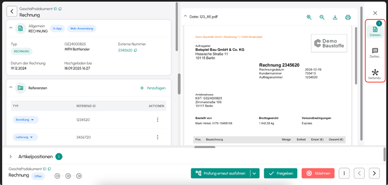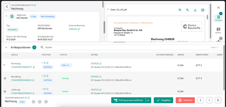 Während sich diese Überprüfung bei wenigen Positionen manuell durchführen lässt, empfiehlt sich bei einer größeren Anzahl die Nutzung der integrierten automatischen Prüfmechanismen. Nach dem Hochladen der relevanten Dokumente können die entsprechenden Prüfungen automatisiert über den Bereich „Automatisierungen“ gestartet werden. Sollten Sie die Prozesse noch nicht voreingestellt haben, klicken Sie dazu auf „Prüfung erneut ausführen“.