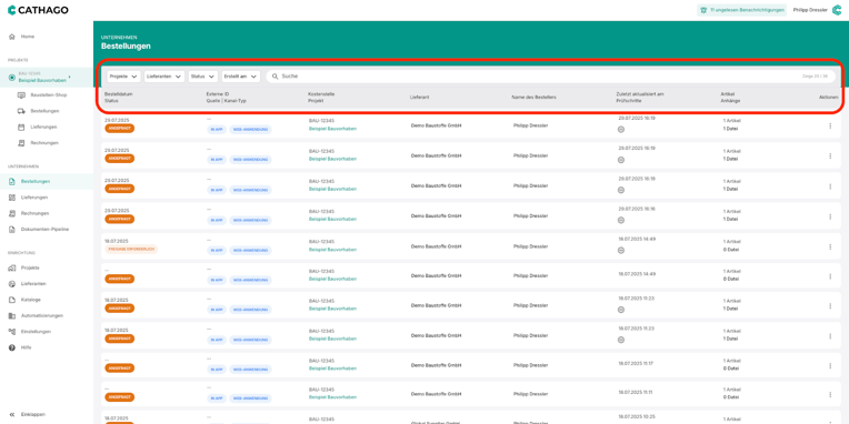 Sie können in dieser Ansicht nach einem bestimmten Projekt, Lieferanten, Bestellstatus und Erstellungsdatum filtern.